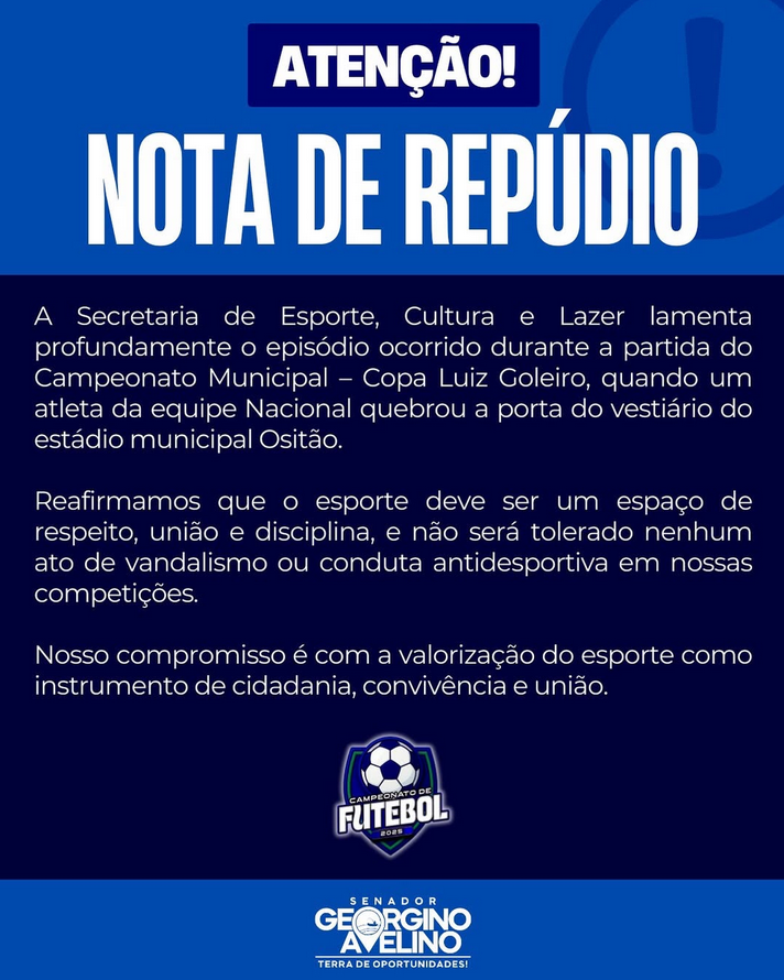 A Secretaria de Esporte, Cultura e Lazer lamenta profundamente o episódio de vandalismo ocorrido durante partida da Copa Luiz Goleiro, no Estádio Municipal Osião.