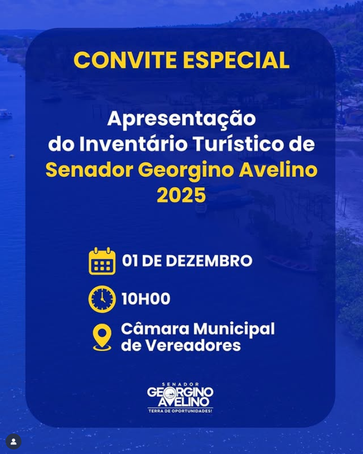 A Secretaria Municipal de Turismo, em parceria com o curso de Turismo da UFRN, convidam empreendedores e toda a população para a apresentação do inventário turístico de Senador Georgino Avelino 2025.