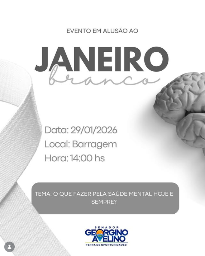 No próximo dia 29, a Prefeitura de Senador Georgino Avelino realiza uma ação em alusão ao Janeiro Branco, mês dedicado à conscientização sobre a saúde mental.