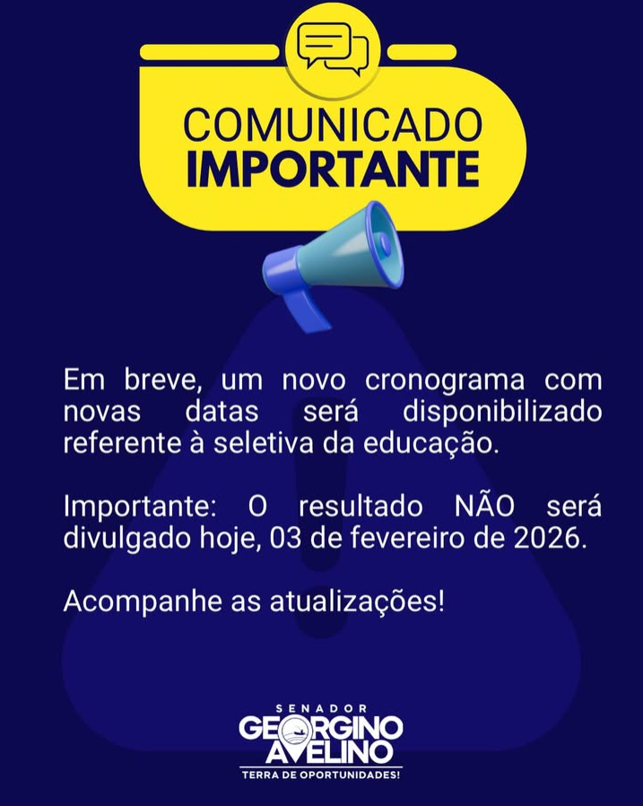 Informamos que em breve será divulgado um novo cronograma, com novas datas, referente à seletiva da Educação.