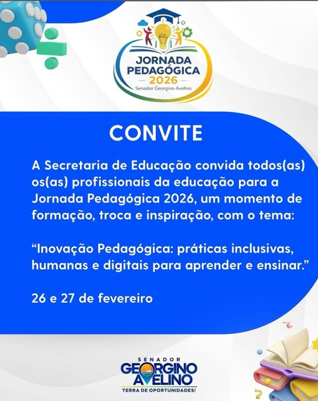 A Secretaria Municipal de Educação convida todos(as) os(as) profissionais da educação para participar da Jornada Pedagógica 2026, um momento de formação, troca de experiências e fortalecimento do fazer pedagógico.