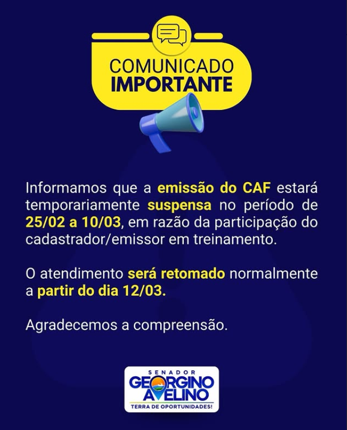 A Prefeitura de Senador Georgino Avelino informa que a emissão do CAF estará temporariamente suspensa no período de 25/02 a 10/03, em razão da participação do cadastrador/emissor em treinamento.