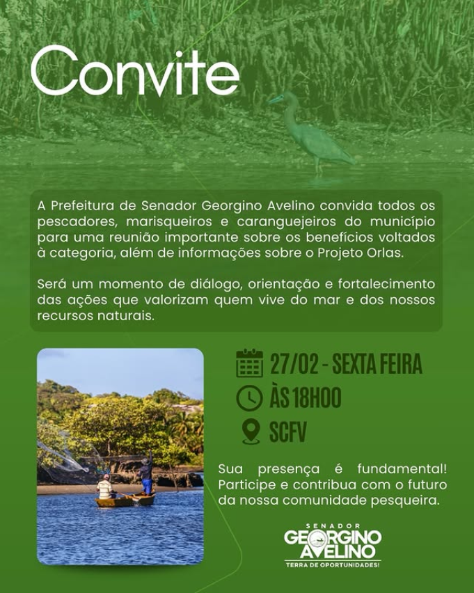 A Prefeitura de Senador Georgino Avelino convida pescadores, marisqueiros e caranguejeiros para uma reunião sobre benefícios da categoria e o Projeto Orlas.