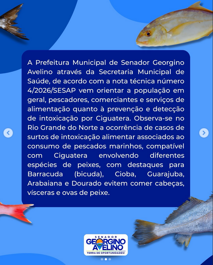 A Prefeitura de Senador Georgino Avelino informa sobre risco de intoxicação por ciguatera associado ao consumo de alguns peixes marinhos.