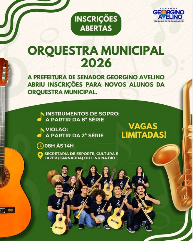 A Prefeitura de Senador Georgino Avelino convida os alunos do município para fazer parte da Orquestra Municipal. Uma oportunidade de aprender música, desenvolver talentos e representar nossa cultura.