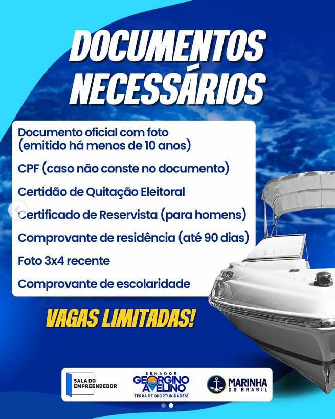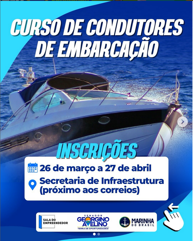 Serão abertas as inscrições para o Curso de Condutores de Embarcação em Senador Georgino Avelino. Uma oportunidade para quem deseja se qualificar e atuar com mais segurança e responsabilidade no mar.