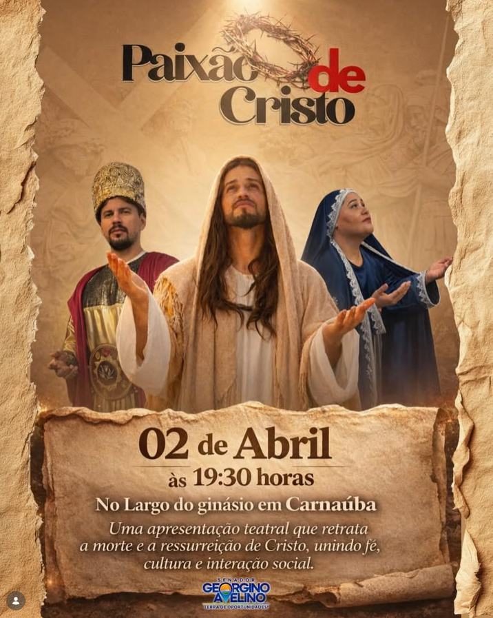 No dia 02 de abril, às 19h30, teremos a encenação da Paixão de Cristo, no Largo do ginásio em Carnaúba.