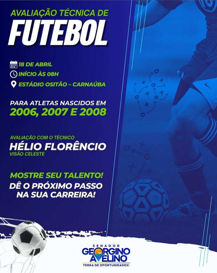 Uma grande oportunidade está chegando em Senador Georgino Avelino! No dia 18 de abril, o Estádio Ositão, em Carnaúba, será palco de uma importante avaliação técnica de futebol com o técnico Hélio Florêncio, do Visão Celeste.