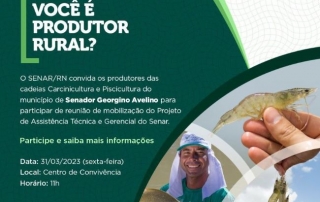 A Prefeitura Municipal de Senador Georgino Avelino, através da Secretaria de Agricultura e Pesca, em parceria com o Sistema Senar/RN, convidam os produtores municipais de Carcinicultura e piscicultura para uma palestra informativa e apresentação do projeto ATEG (Assistência Técnica e Gerencial). O projeto irá auxiliar em uma melhor cadeia […]