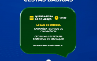 Atenção!A prefeitura municipal de Senador Georgino Avelino realizará nesta quarta-feira (08) a distribuição de cestas básicas para pessoas em situação de vulnerabilidade social.