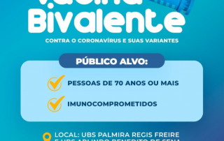 Nesta segunda-feira (06) começa a vacinação bivalente contra o Coronavírus e suas variantes. Público alvo: Pessoas de 70 anos ou mais e imunocomprometidos. A vacinação ocorrerá nas unidades básicas de Saúde do município.