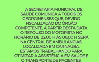 A Secretaria Municipal de Saúde comunica a todos os Georginenses que, devido fiscalização do órgão competente, a partir desta data o REPOUSO DO MOTORISTA no horário de 22:00 h às 06:00 h será na Central de Ambulâncias, localizada em Carnaúba. Tal situação é temporária, consta no planejamento a construção […]