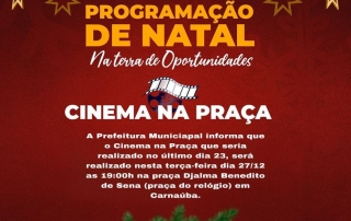 A noite de hoje (27/12), foi marcante, com mais uma edição do Cinema na Praça, que desta vez aconteceu em Carnaúba, finalizando assim a nossa programação natalina. Dezembro marca mais um momento de alegria na vida do nosso povo!