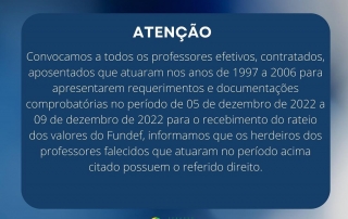 Convocamos a todos os professores efetivos, contratados, aposentados que atuaram nos anos de 1997 a 2006 para apresentarem requerimentos e documentações comprobatórias no período de 05 de dezembro de 2022 a 09 de dezembro de 2022 para o recebimento do rateio dos valores do Fundef, informamos que os herdeiros […]