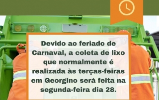A coleta de lixo em Georgino que normalmente é realizada às terças-feiras, será feita excepcionalmente na segunda dia 28, devido ao feriado de carnaval, a coleta começará a partir do meio dia.