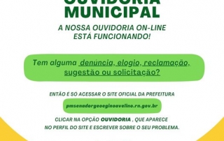A Prefeitura Municipal de Senador Georgino Avelino conta com uma ouvidoria on-line onde você pode fazer sugestões e reclamações sem precisar sair de casa. Basta acessar o nosso site oficial: pmsenadorgeorginoavelino.rn.gov.br clicar na opção “ouvidoria” que aparece assim que o usuário entra no site e pronto. Já pode escrever […]