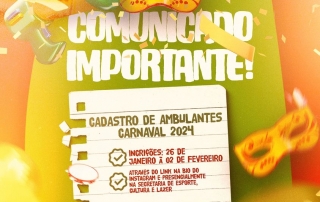 As inscrições para comercialização durante o Carnaval estão agora disponíveis. De 26 de janeiro a 02 de fevereiro, você pode se inscrever online através do link em nossa Bio do Instagram ou presencialmente na Secretaria de Esporte, Cultura e Lazer.
