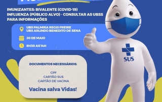 Neste sábado, 20 de maio, ocorre o “DIA DE MULTIVACINAÇÃO” nas UBS’s Palmira Regis Freire e Arlindo Benedito de Sena. A ação terá início às 08h30 e vai até as 14h.