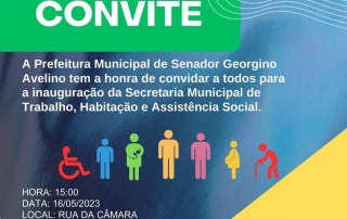 A Prefeitura Municipal convida a todos, para a inauguração da Secretaria Municipal de Trabalho, Habitação e Assistência Social, que acontecerá nesta terça – feira (16), ás 15h da tarde, na rua da Câmara Municipal. Participe!
